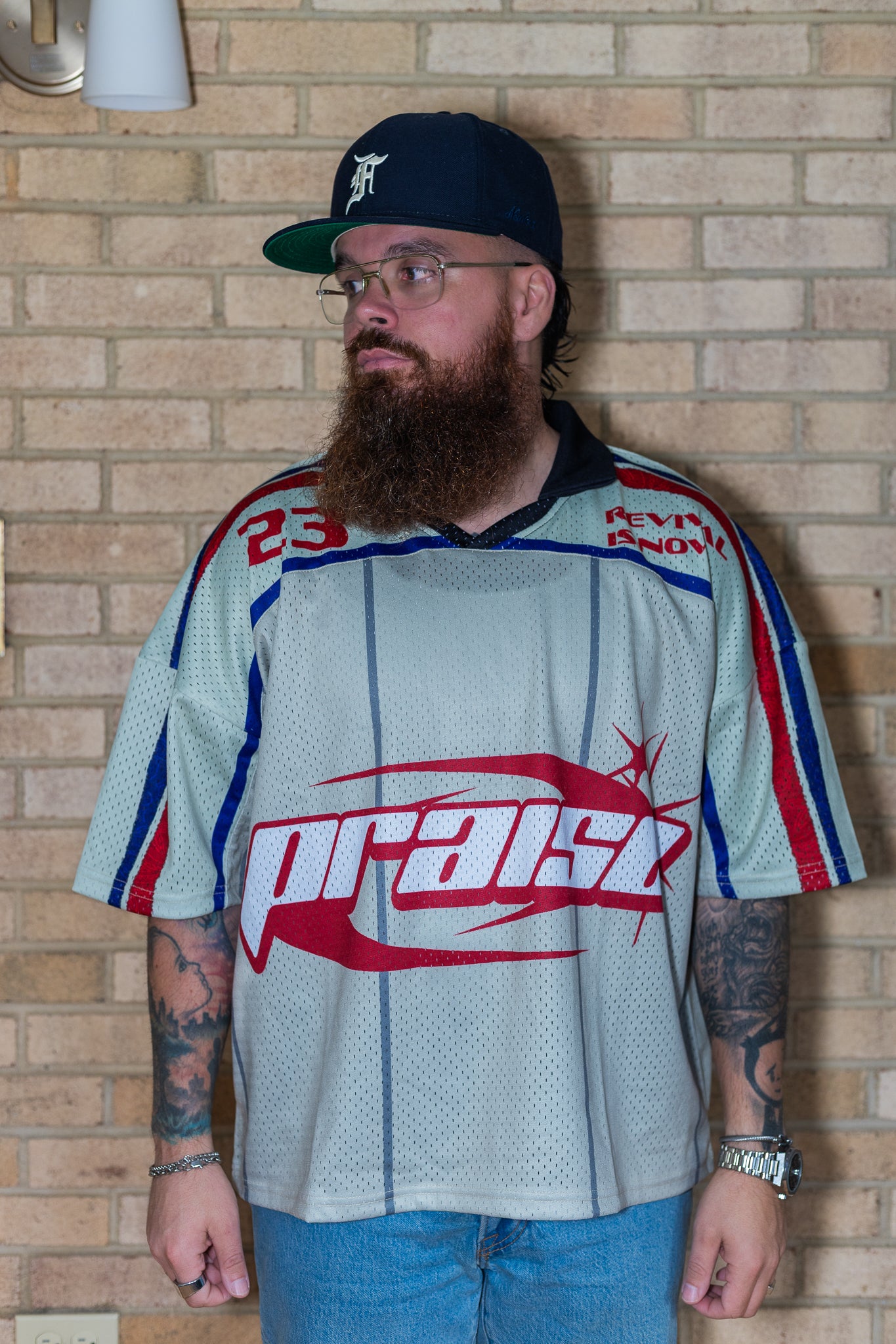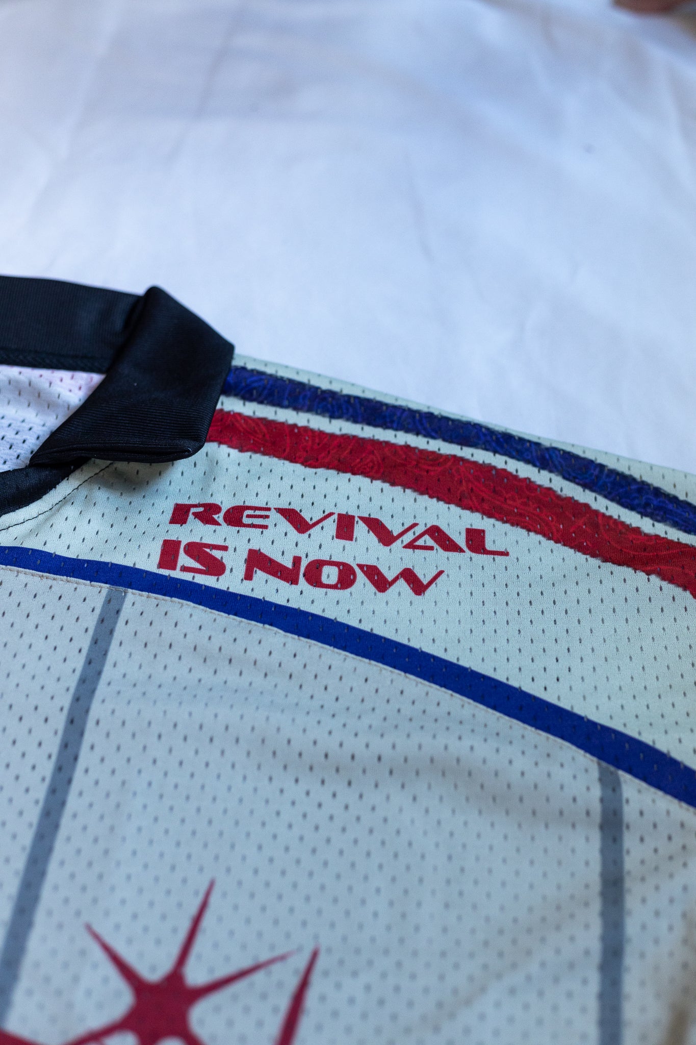 The Cristo Raptors Edition Jersey reimagines the classic soccer kit as a luxury streetwear statement. Featuring Cristo lettering across the back, a No Ceilings badge, and Revival Is Now statement, this oversized, boxy jersey is designed for collectors and faith-inspired fashion enthusiasts. Inspired by Toronto Raptors oatmeal, red, purple, and black tones, it is part of the limited Cristo Capsule.