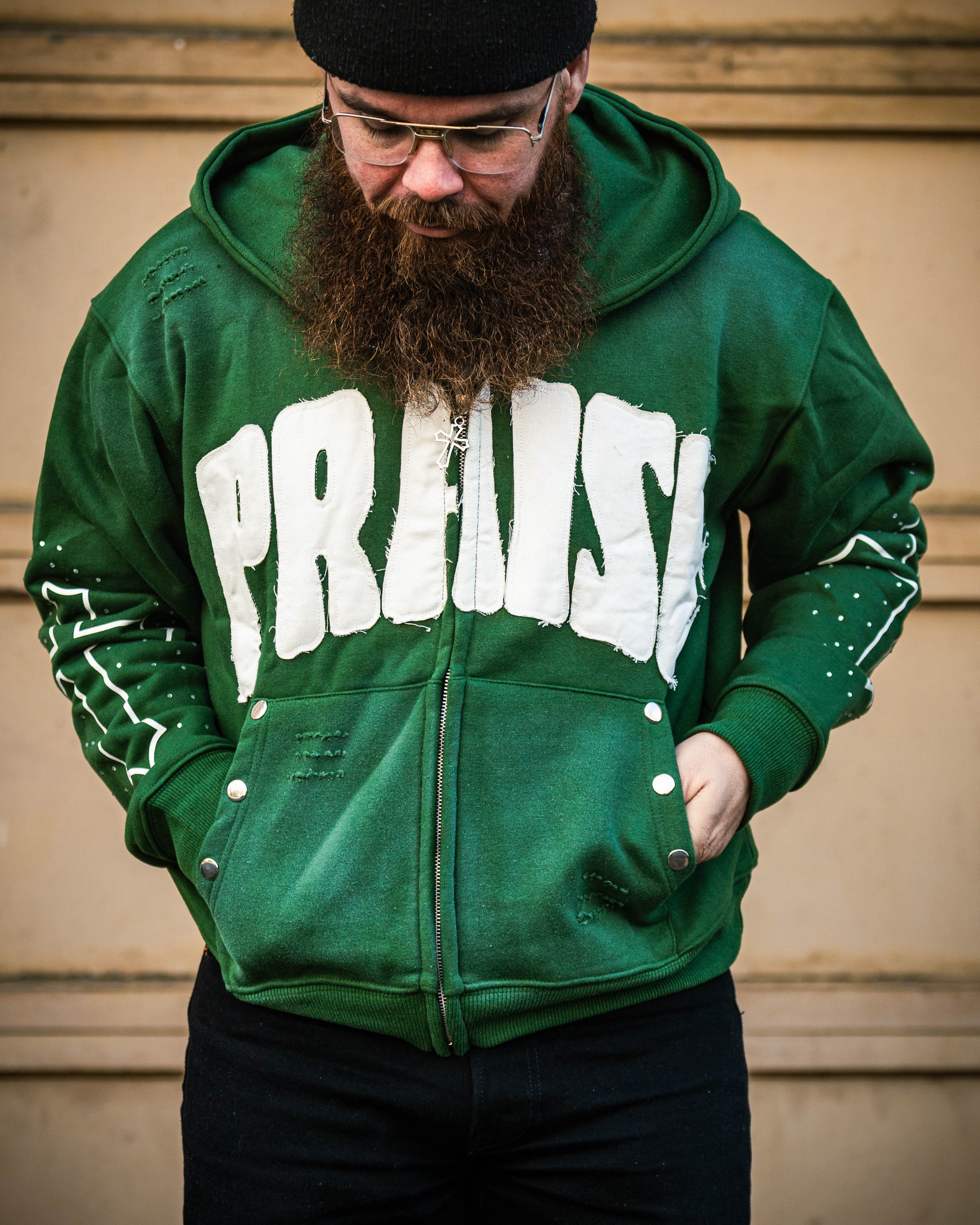 The Praise Zip Up Hoodie is where streetwear meets faith, merging vintage grunge elements with meticulous craftsmanship. It is oversized, unapologetically bold, and a standout addition to any faith-forward wardrobe.