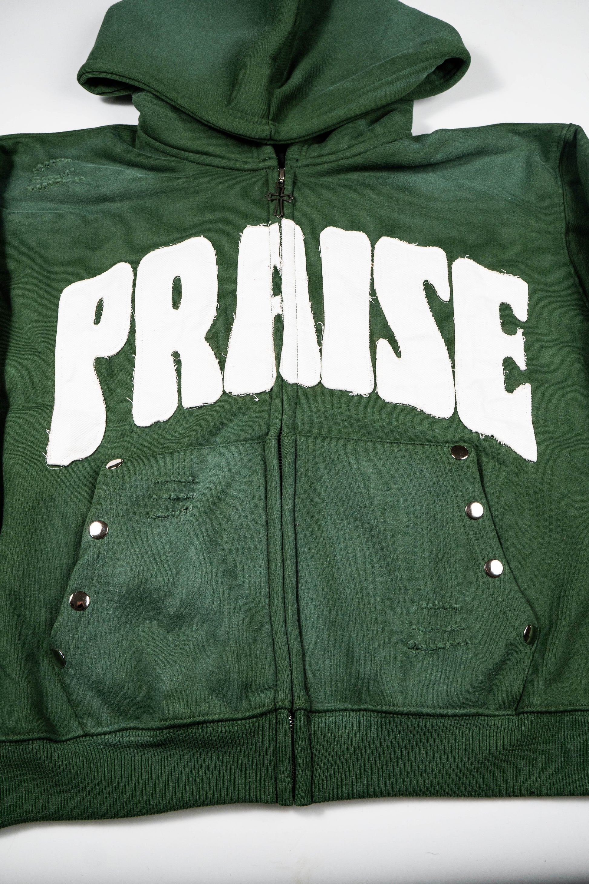 Embroidered Praise patch across the chest, designed to seamlessly hide the zipper so the letters connect