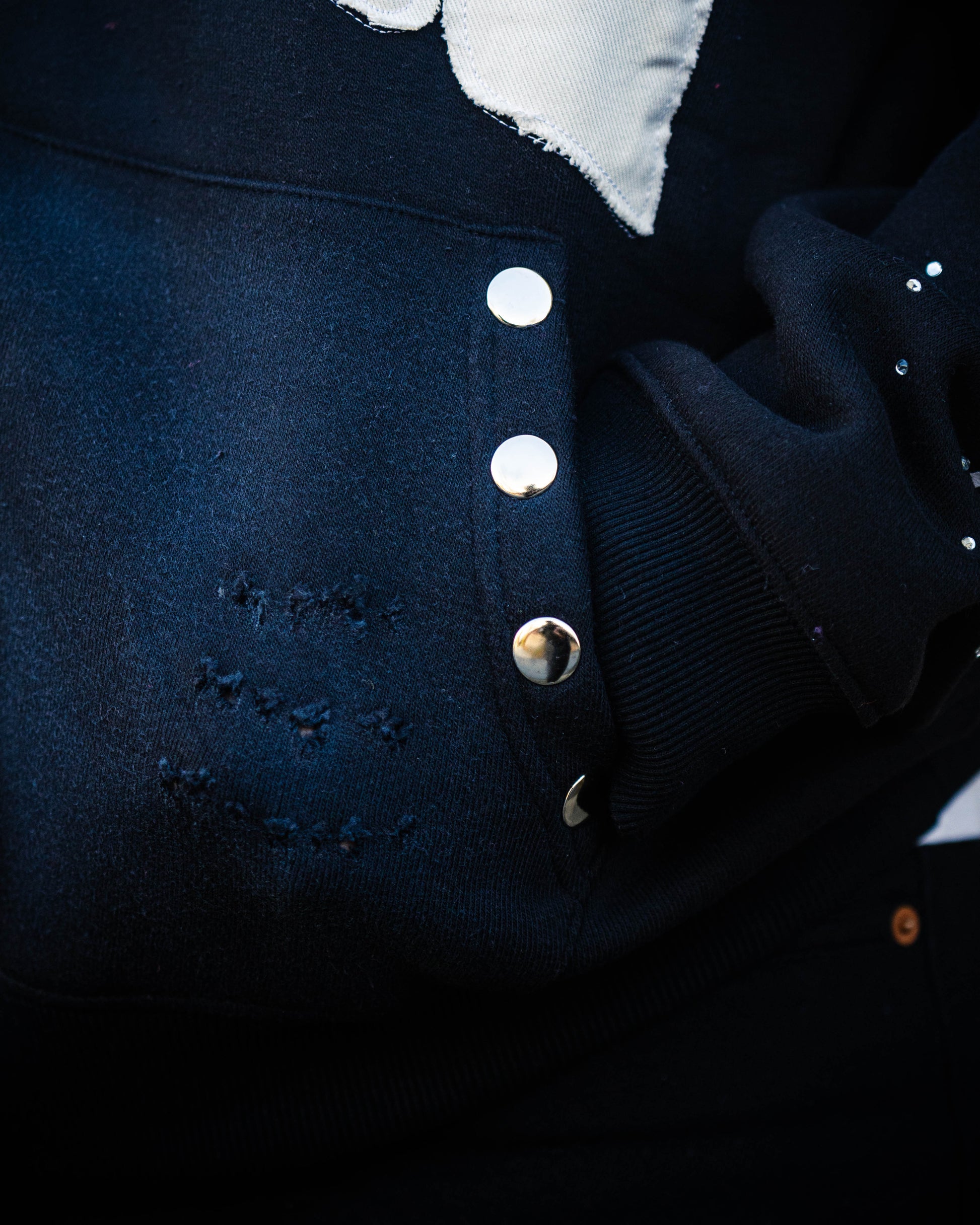 Screen printed cross on the sleeve with hand-placed white rhinestones for flawless detailing