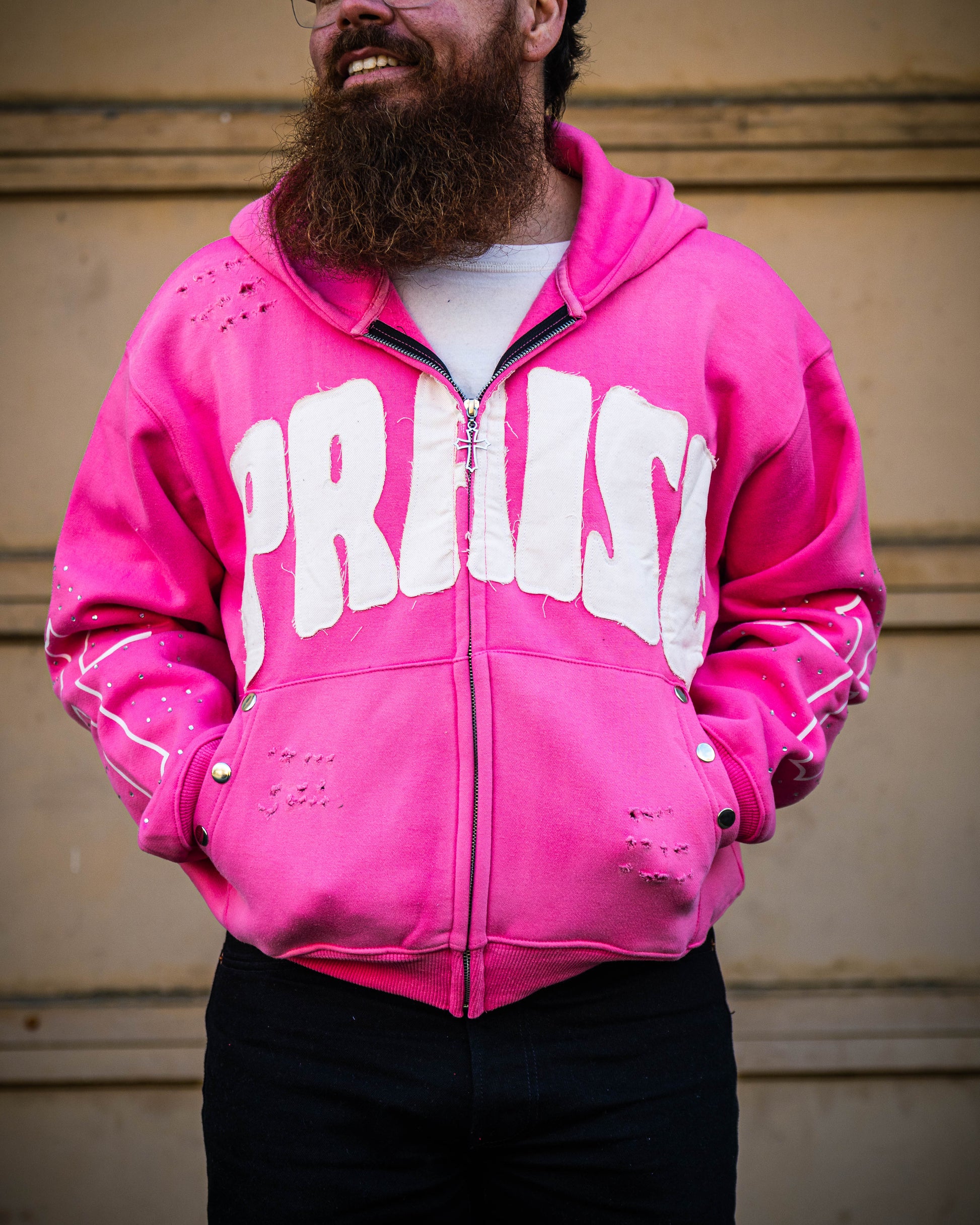 Embroidered Praise patch across the chest, designed to seamlessly hide the zipper so the letters connect