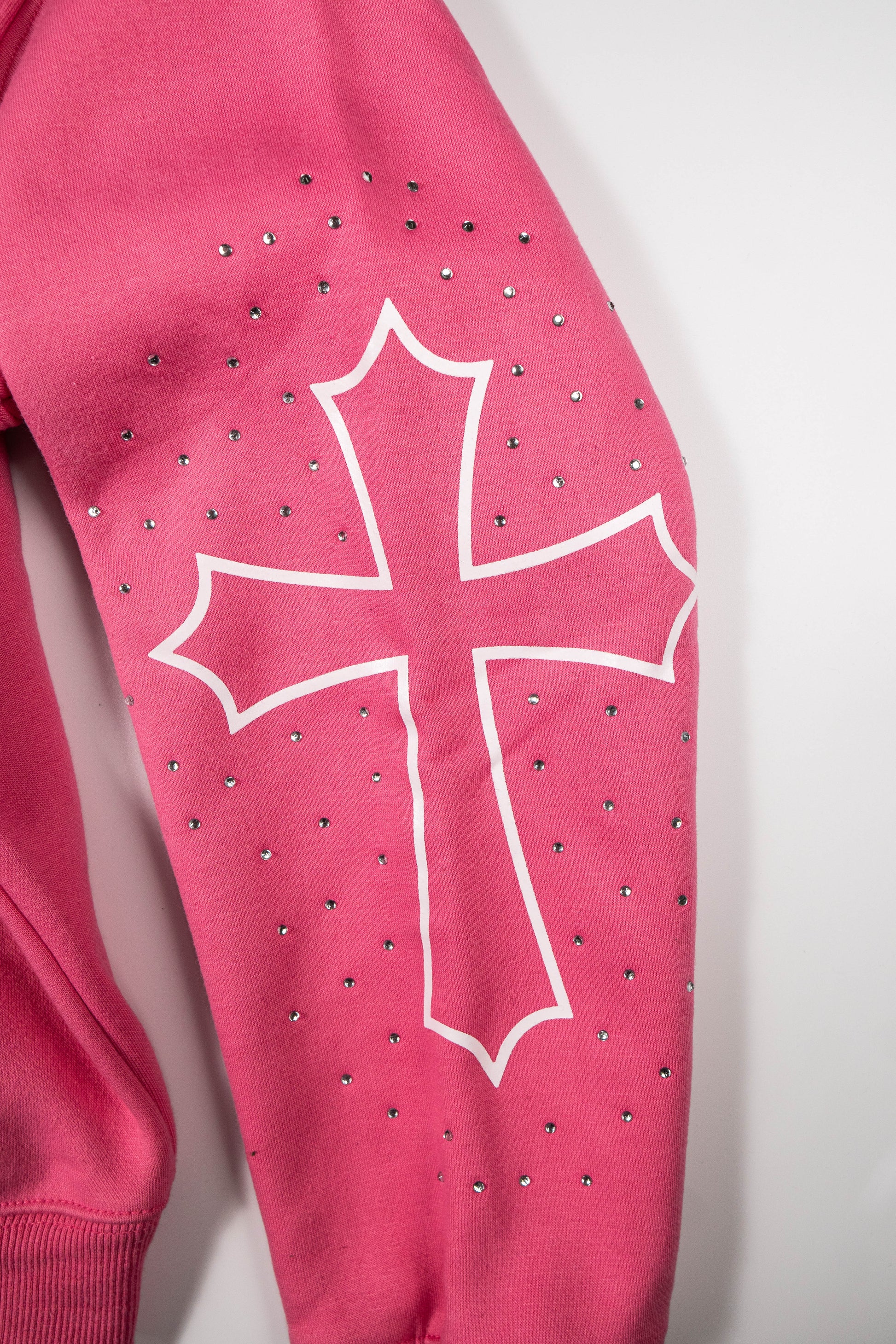 Screen printed cross on the sleeve with hand-placed white rhinestones for flawless detailing